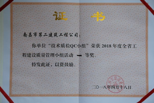 昨日,在全省QC成果發(fā)布會(huì)上,公司技術(shù)質(zhì)檢QC小組榮獲2018年度全省工程建設(shè)質(zhì)量管理小組活動(dòng)一等獎(jiǎng)。