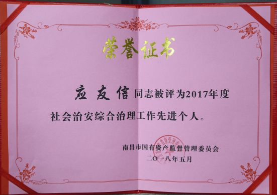 公司社會(huì)治安綜合治理和信訪工作榮獲國資委2017年度先進(jìn)單位,陳國明、應(yīng)友信同志榮獲國資委2017年度先進(jìn)個(gè)人稱號(hào)。